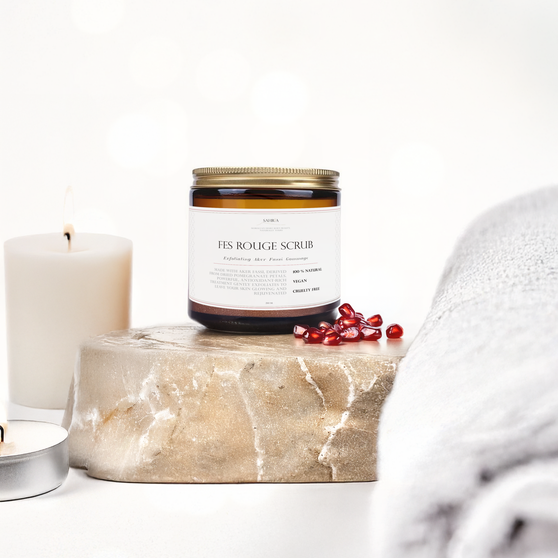 Our Fes Rouge Scrub is a lush, all-over body exfoliant handcrafted with aker fassi — a traditional Moroccan blend of dried poppy petals and pomegranate. Designed to be used on any part of the body, this scrub gently buffs away dead skin, cleanses deeply, and leaves your skin feeling silky-smooth and radiant. As you rinse, the scent of sun-dried pomegranate lingers on your skin — sweet, warm, and unmistakably Moroccan. It’s more than exfoliation — it’s a moment of beauty rooted in heritage
